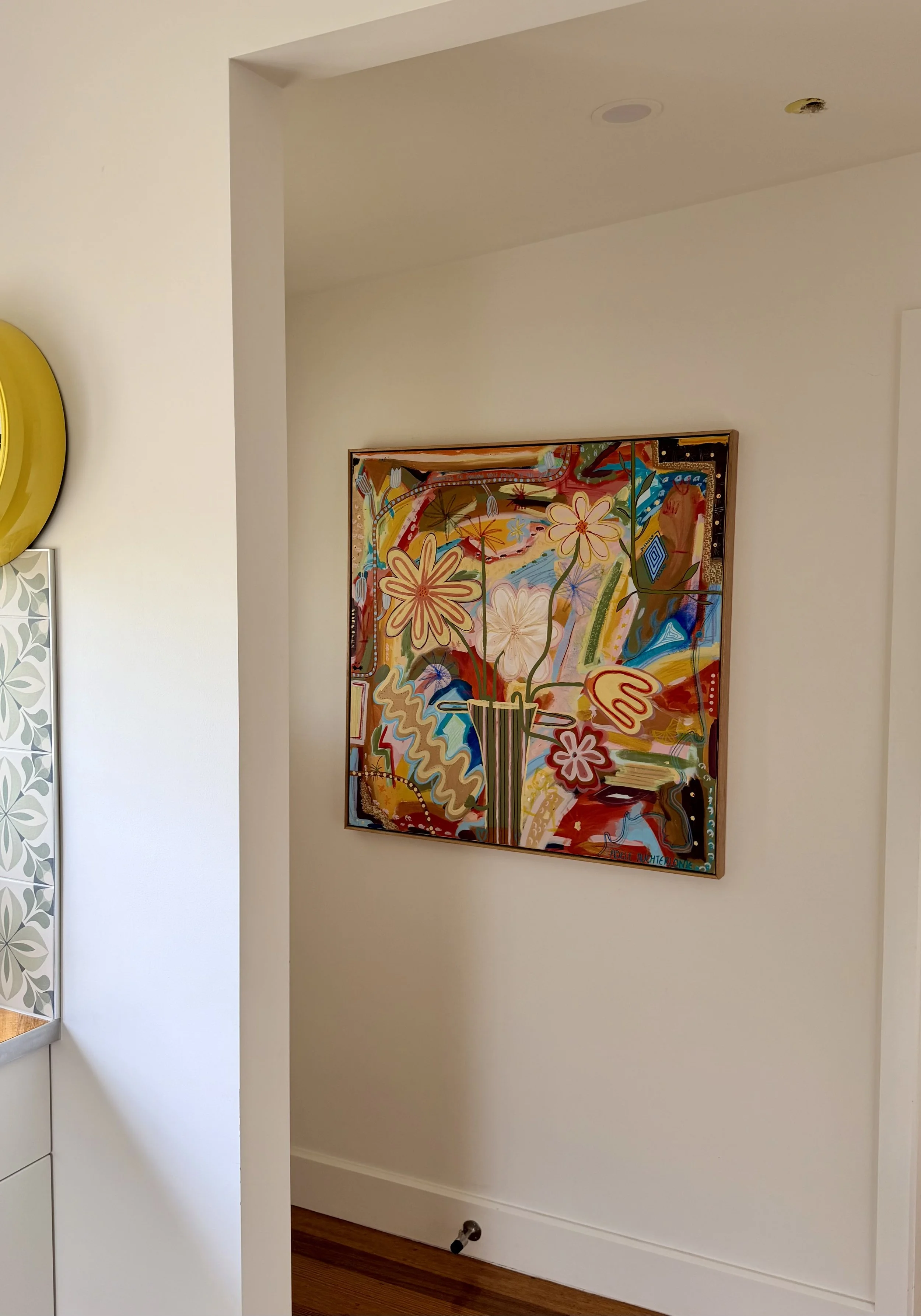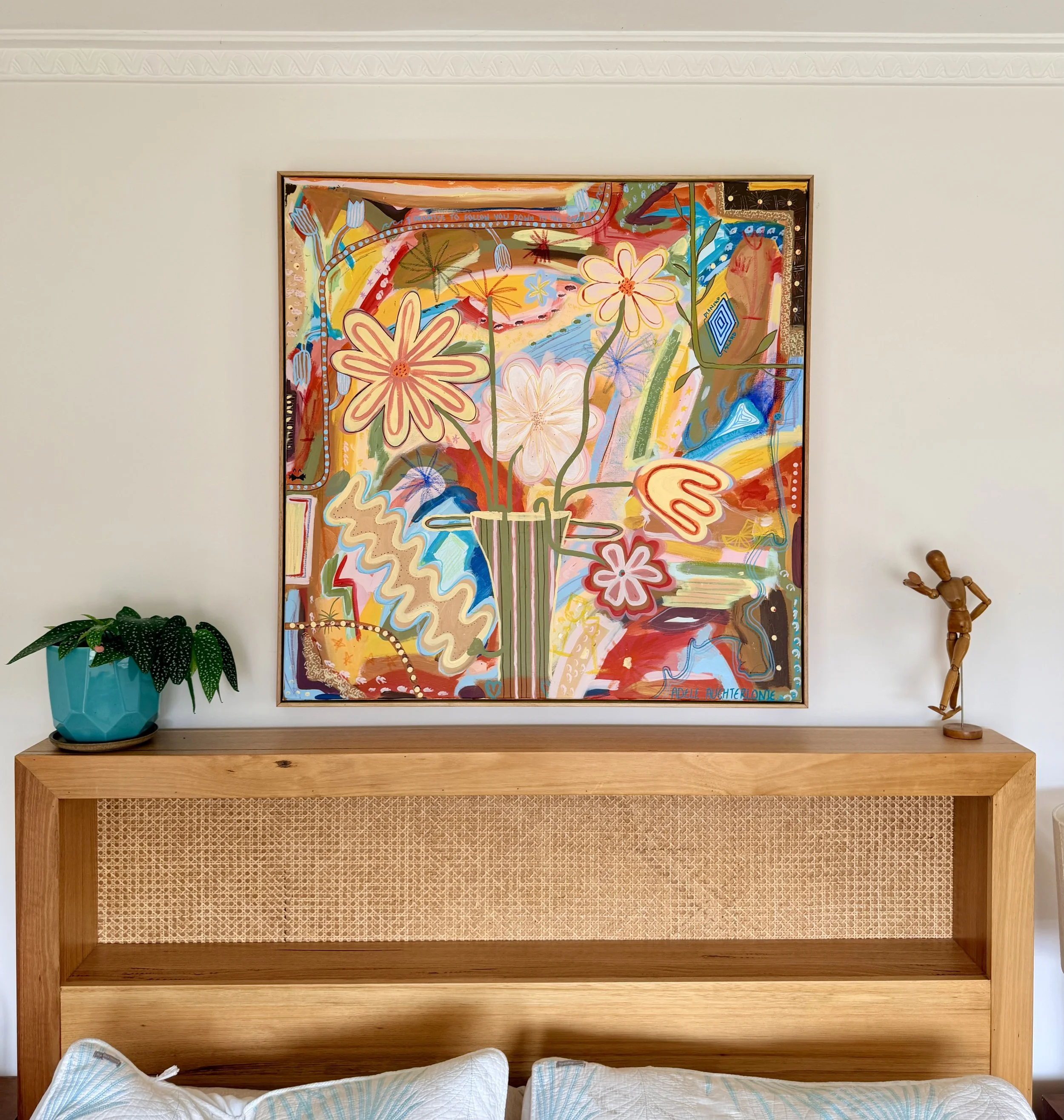 Bloom is an artwork that was commissioned for a collector as a present for their Husband on their wedding day. The work encapsulated all the things that were special to them and also included many little details of places they love to visit and things they love whilst keeping the work very grounding and calm as a statement in their home.