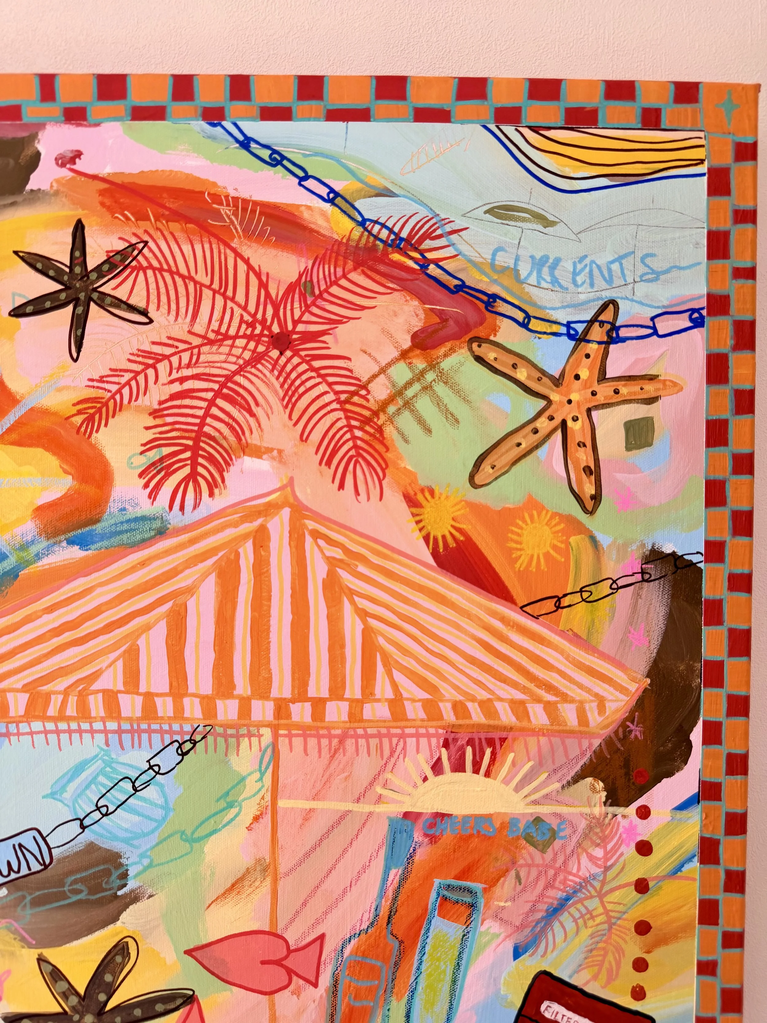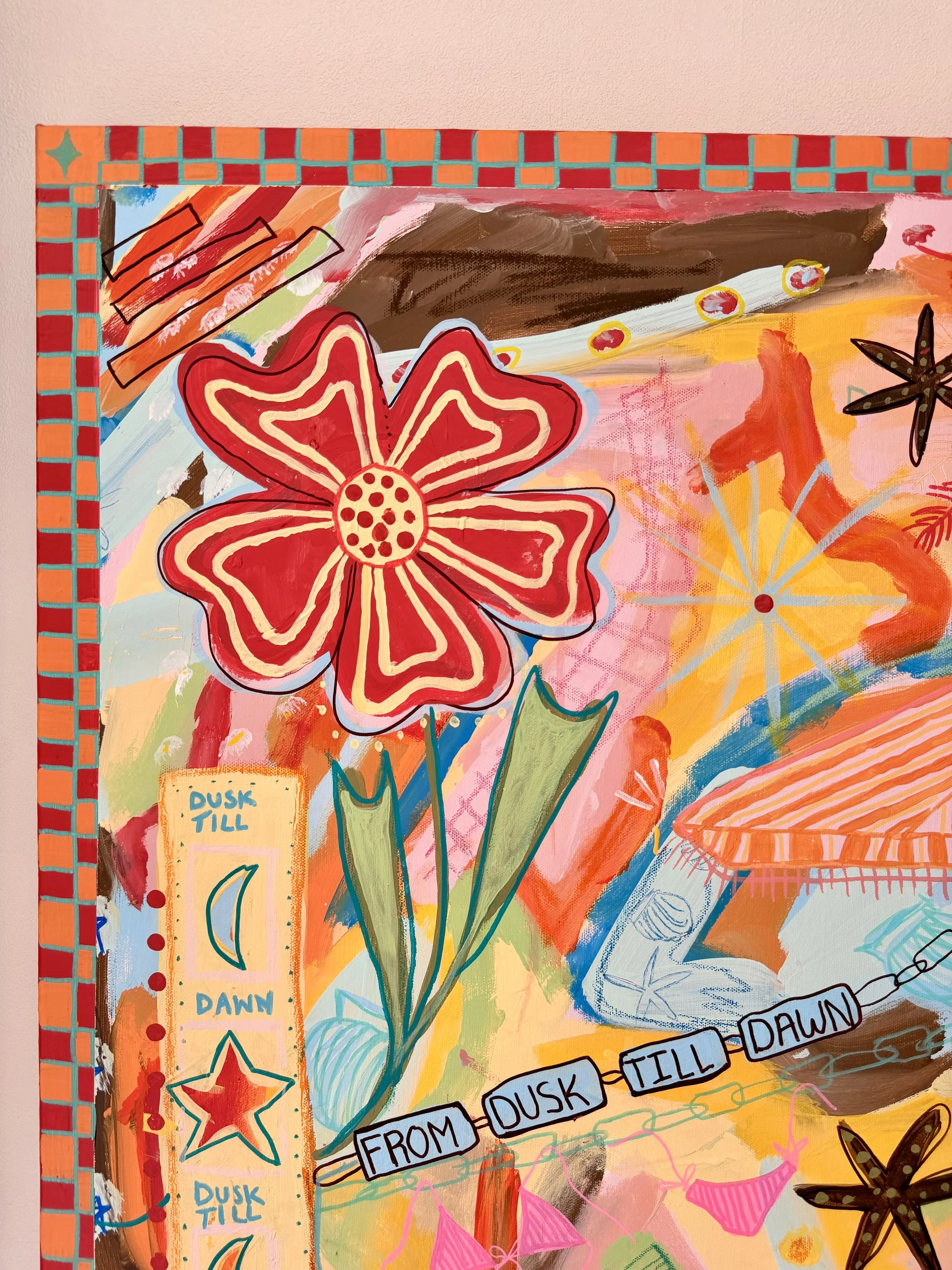 From Dusk Till Dawn is a commissioned work inspired by the rhythm of a perfect summer day. Created in collaboration with the client, the piece weaves together the moments, objects, and energy she loves most capturing that effortless flow from first light to last glow. Playful, groovy, and sun soaked, the work celebrates living fully in the in between: where days stretch long, time feels loose, and everything just clicks.